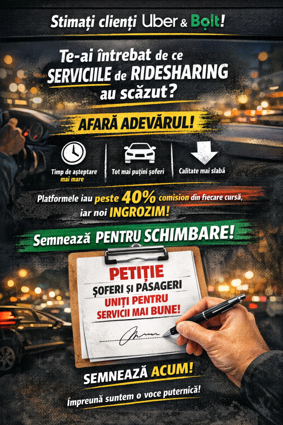 Împreună putem transmite un mesaj clar: vrem servicii corecte, sustenabile și de calitate — atât pentru șoferi, cât și pentru clienți.