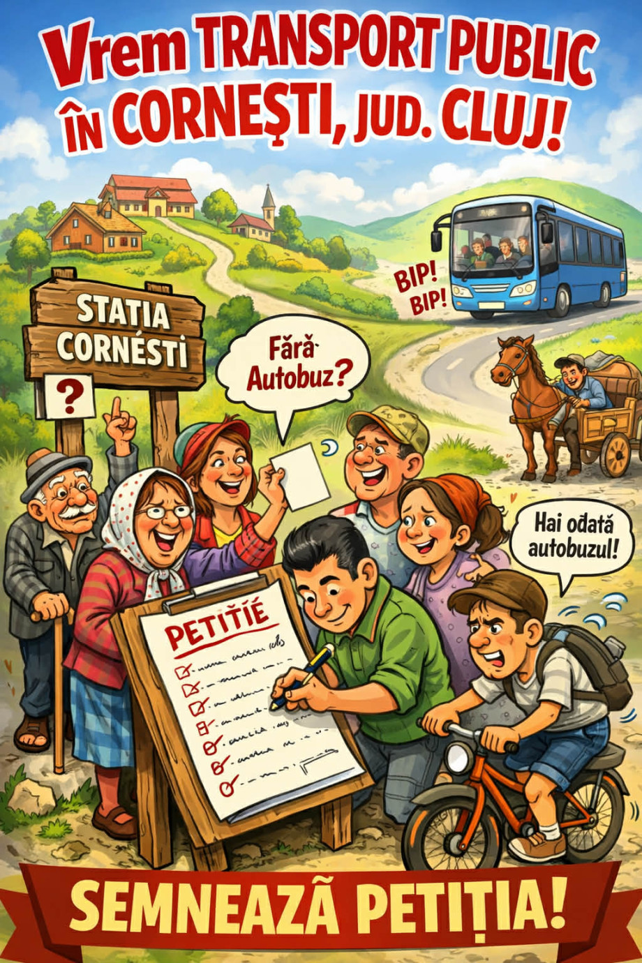 Semneazǎ si tu aceastǎ petiție dacǎ îți dorești sǎ circuli cu autobuzul în Cornești!