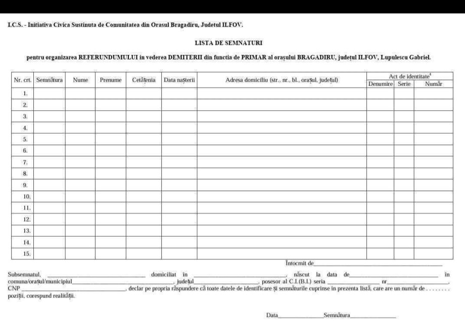 Petitie pentru dizolvarea Consiliului Local al Orasului Bragadiru, Ilfov