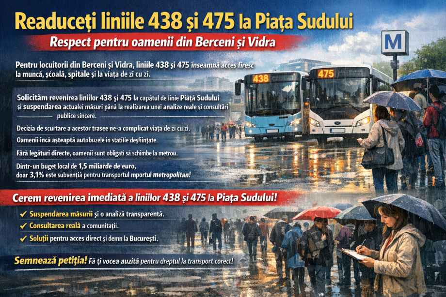 Solicităm revenirea liniilor 438 și 475 la capătul de linie Piața Sudului și suspendarea actualei măsuri până la realizarea unei analize reale, transparente și a unei consultări publice