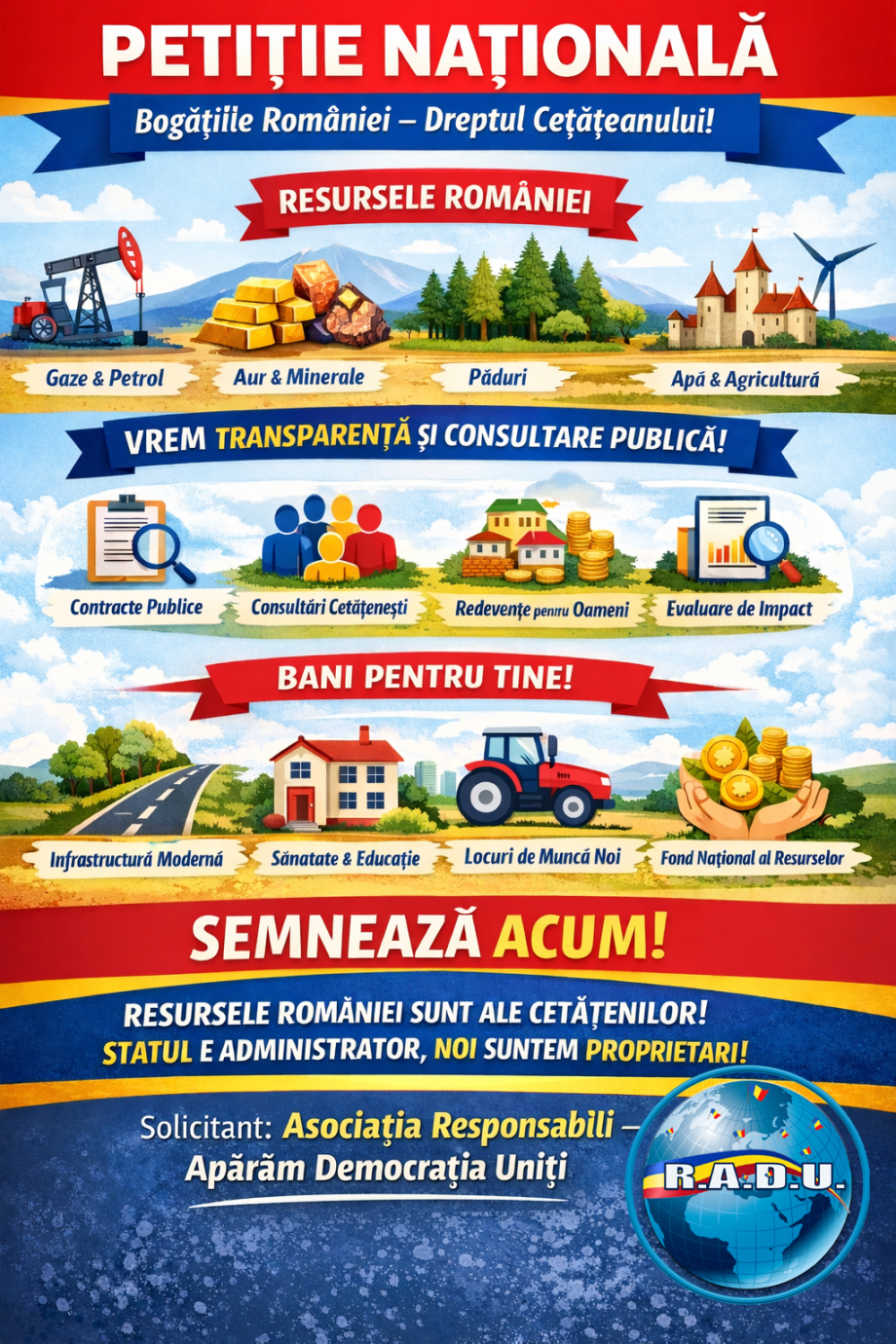 Inițiator: Asociația Responsabili – Apărăm Democrația Uniți „Bogățiile României ne aparțin nouă! Statul este administrator, cetățeanul este proprietar!”