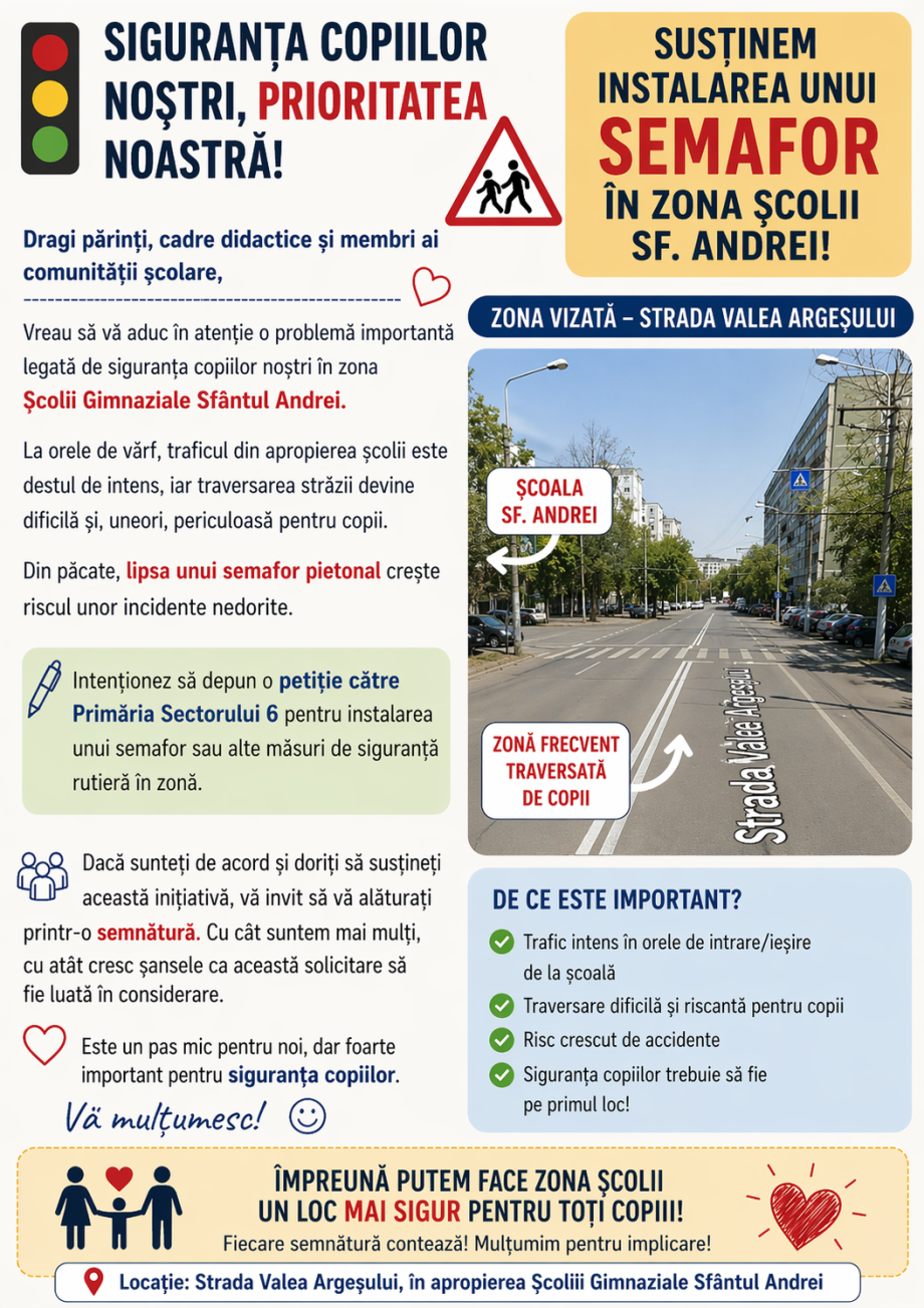Siguranța elevilor în zona Școlii Gimnaziale Sfântul Andrei – solicitare instalare semafor pietonal