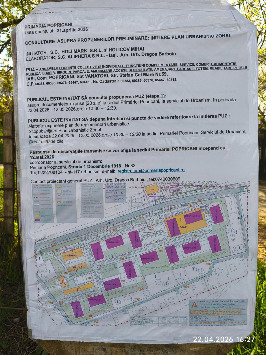 Primăria Popricani a lansat consultarea publică pentru un proiect care va schimba definitiv fața satului nostru: construirea unui ansamblu de blocuri masive (regim de înălțime până la P+6) chiar în inima unei zone exclusiv de case din satul Vânători.